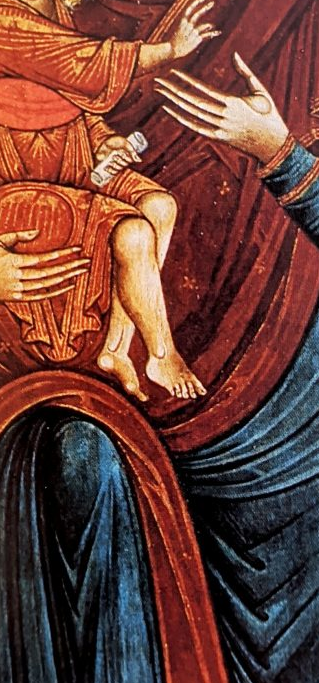 Il bambino, quel Bambino, seduto sulle gambe di Maria, ha i piedini in movimento, non sono poggiati, non fermi, ma penzolanti, sembrano muoversi, desiderosi di fuggire, per andare, correre.
